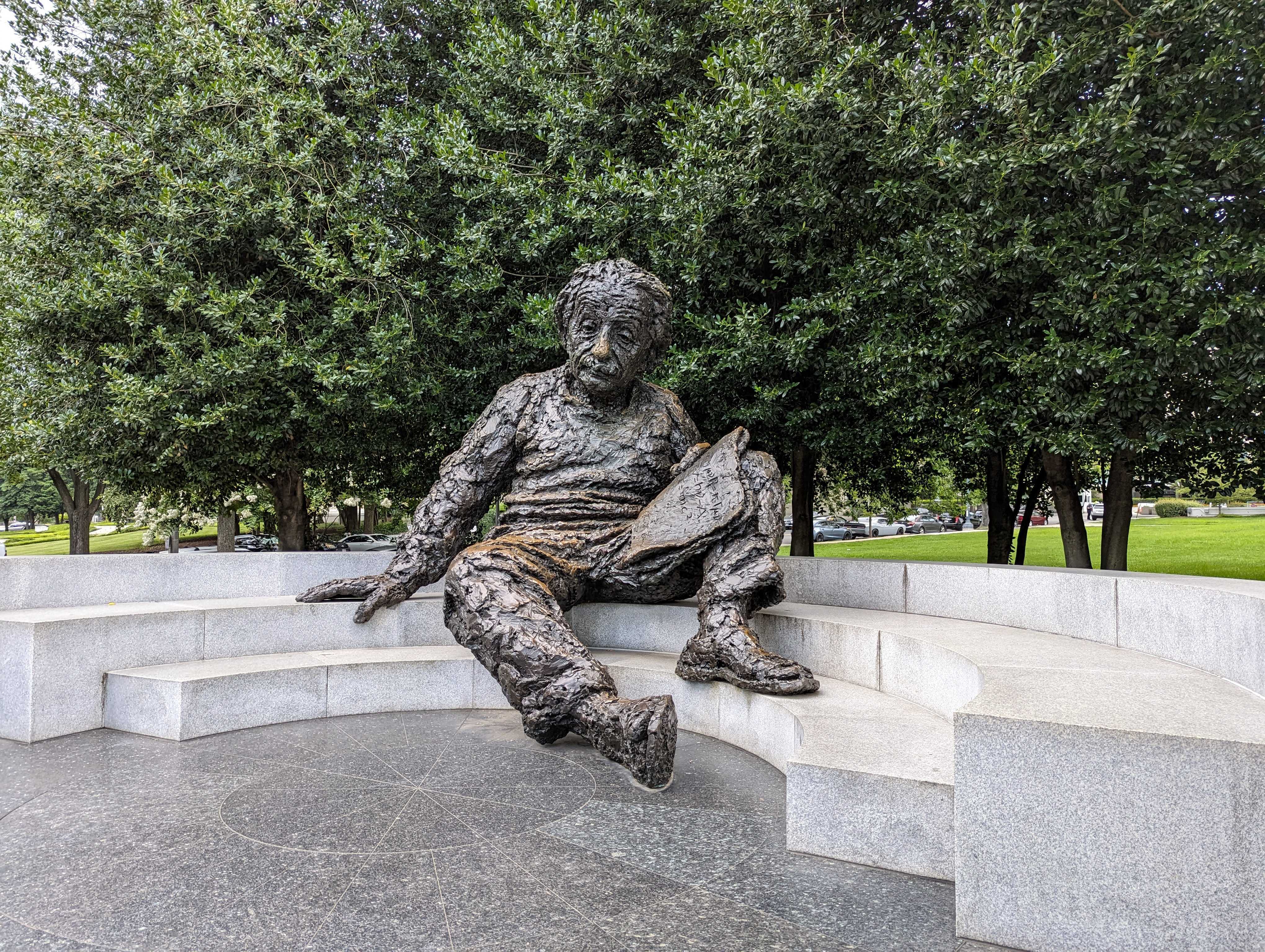 My dad was in the Vietnam War, and it was hard not to think about which of the people n the monument he may have known, been friends with, fought beside. We meandered along the length of the wall, trying to remind the younger kids about the seriousness of what the memorial represents, but honestly they're just too young to really grasp it. We kept walking around the corner and crossed the street, walking a few blocks down to a large statue of Einstein. The kids posed for another picture and "C" insisted on giving him a big hug, before we walked back to the bus stop. The air was actually beginning to feel cool and the wind had picked up, so the thunderstorms were coming, just a bit late.