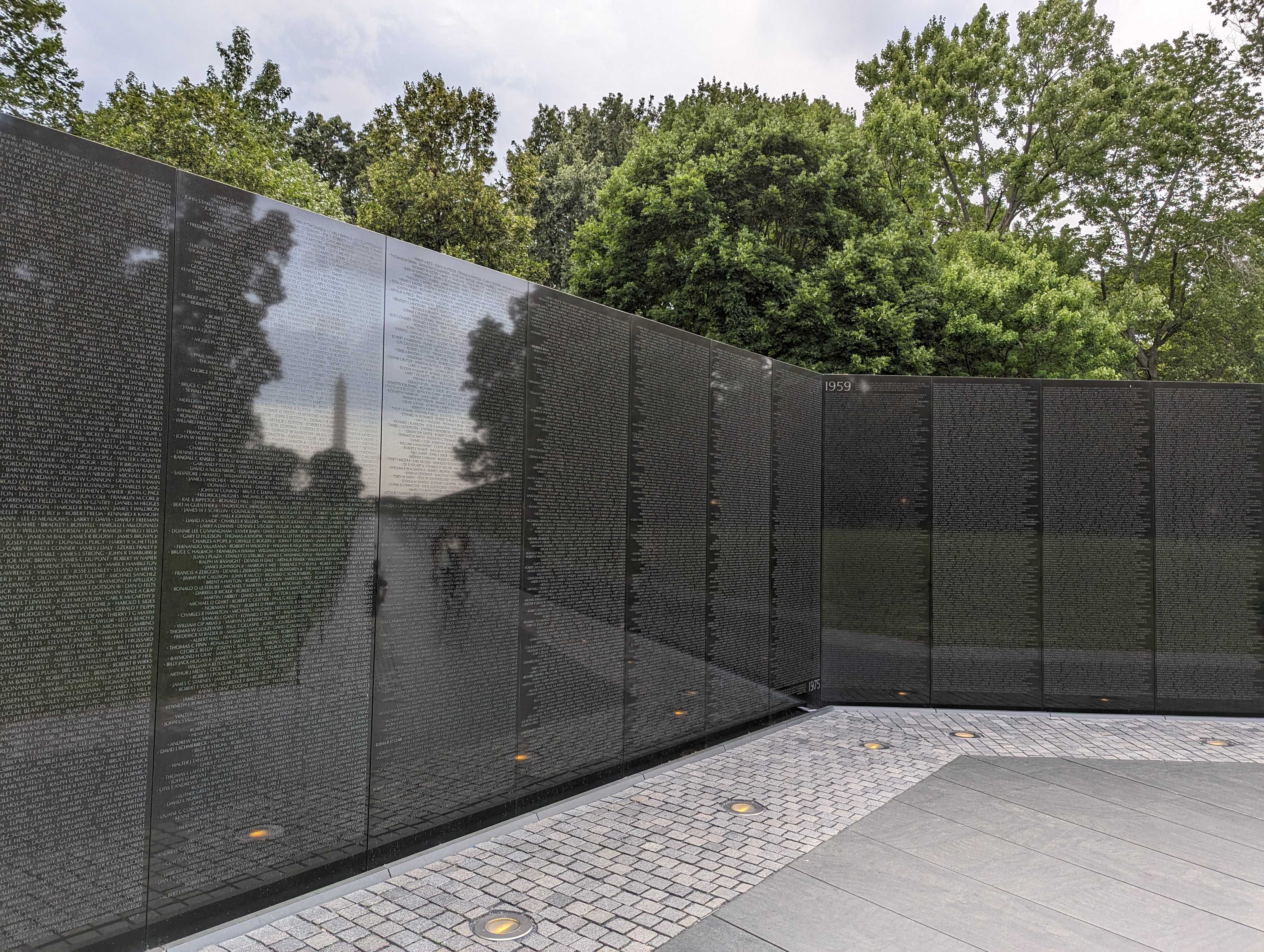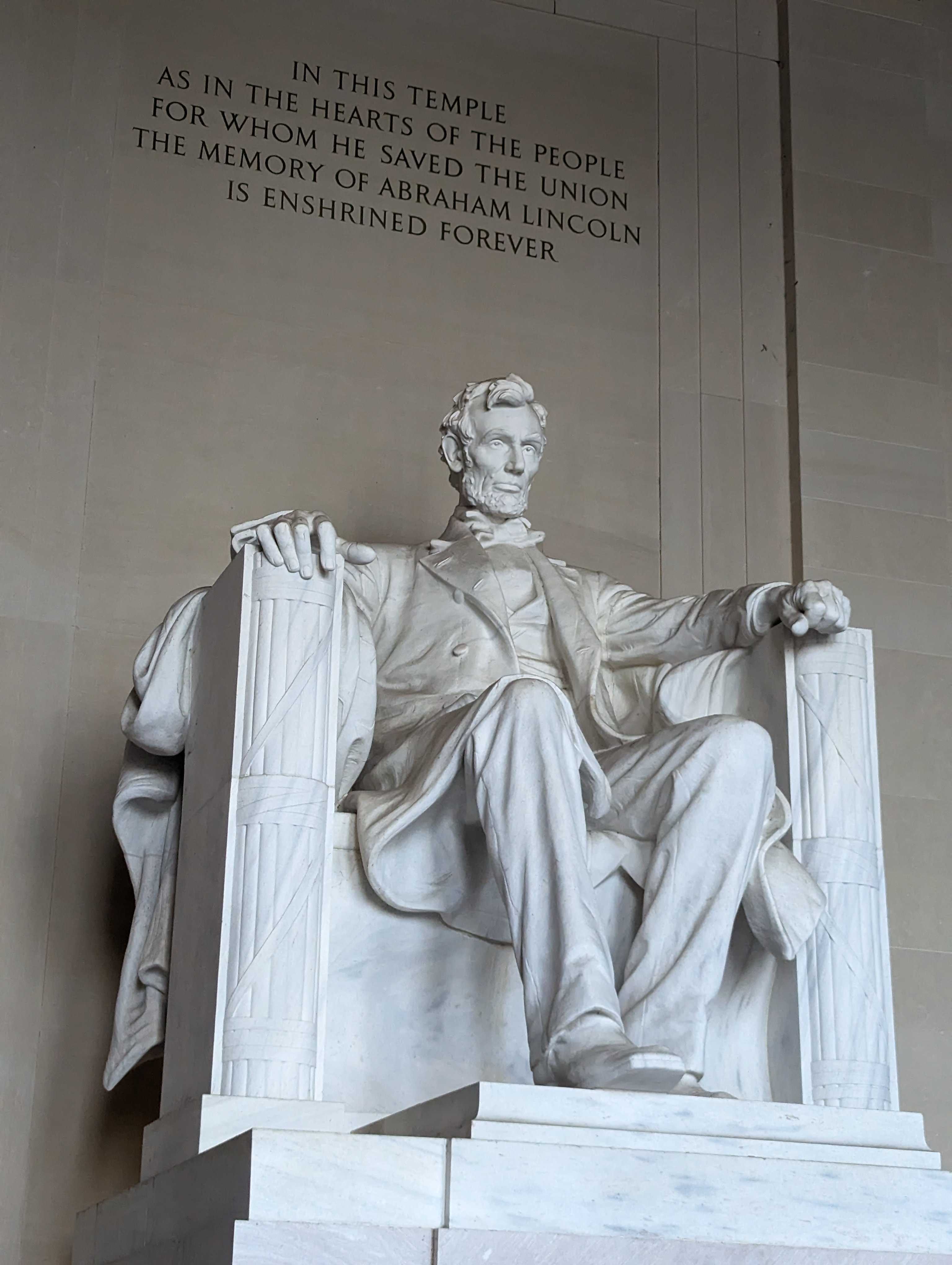 We walked a bit further down and over to the Lincoln Monument, sitting opposite of the Capitol building across the National Mall. This was being renovated and there were an incredible number of tourists visiting the monument. We snapped a couple pictures before riding the elevator down into the mini Lincoln museum at the base of the monument. The air conditioning felt incredible in here, so we slowly meandered through some of the stone slabs etched with his quotes. Walking out of the building, the humidity was still quite high but the heat was a bit less brutal. We kept heading left and over to the Vietnam War Memorial.
