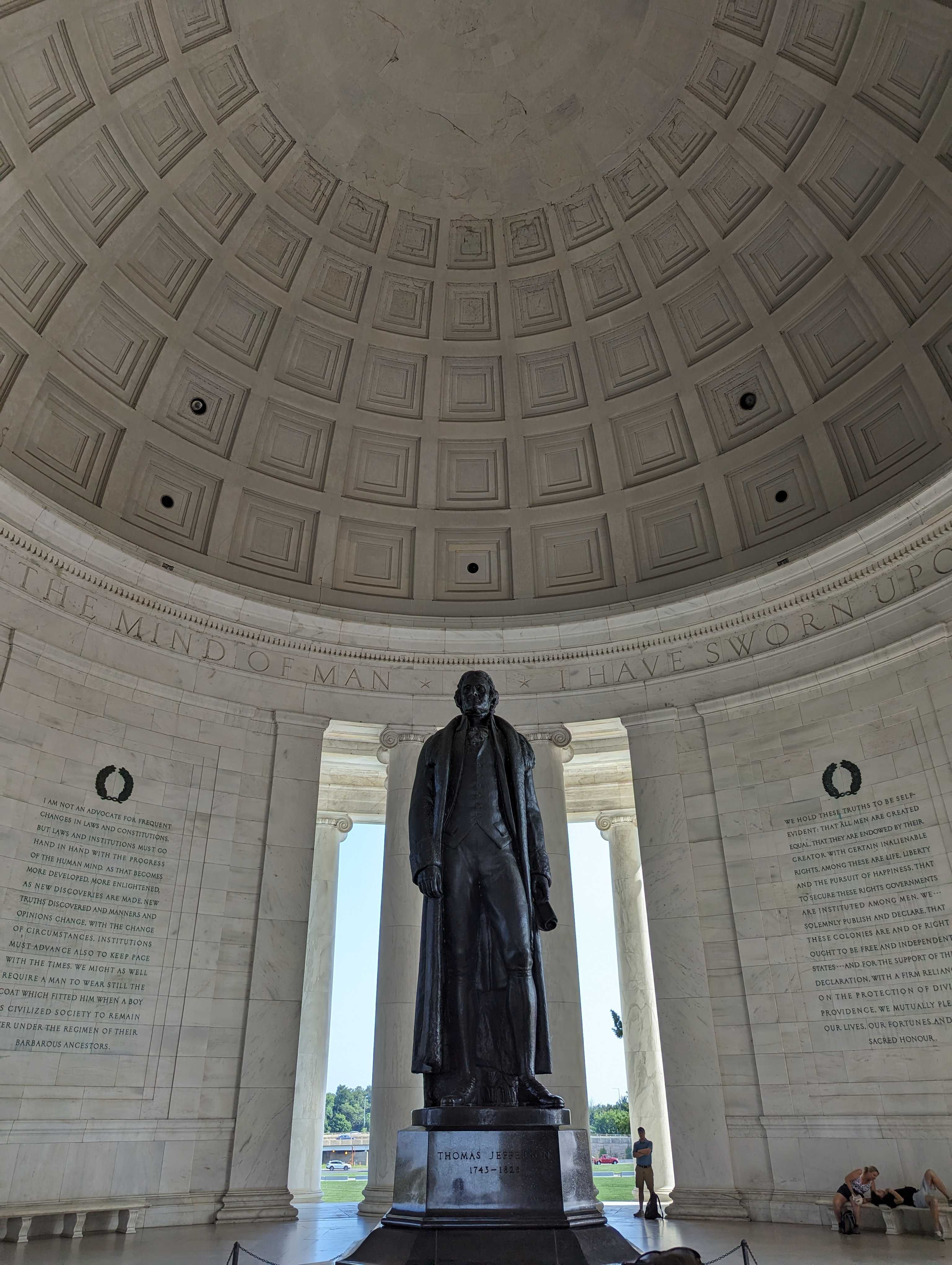 It was close to 5 by this point, and the clouds were just starting to roll in but it was still mostly just hot and sunny. Up next were the numerous memorials in the area. We took our first trip on the DC Circulator bus as the stop was only a few blocks away. "K" has been to Washington DC a few times but has never been to the Jefferson Memorial, and none of the rest of us have been here at all, so we were all interested in this one. There were a few stairs up to a large marble pagoda with a statue of Jefferson in the middle and quotes of his around the interior of the pagoda. There was shade and a cool breeze, so we stayed there while the kids had an apple for a snack.