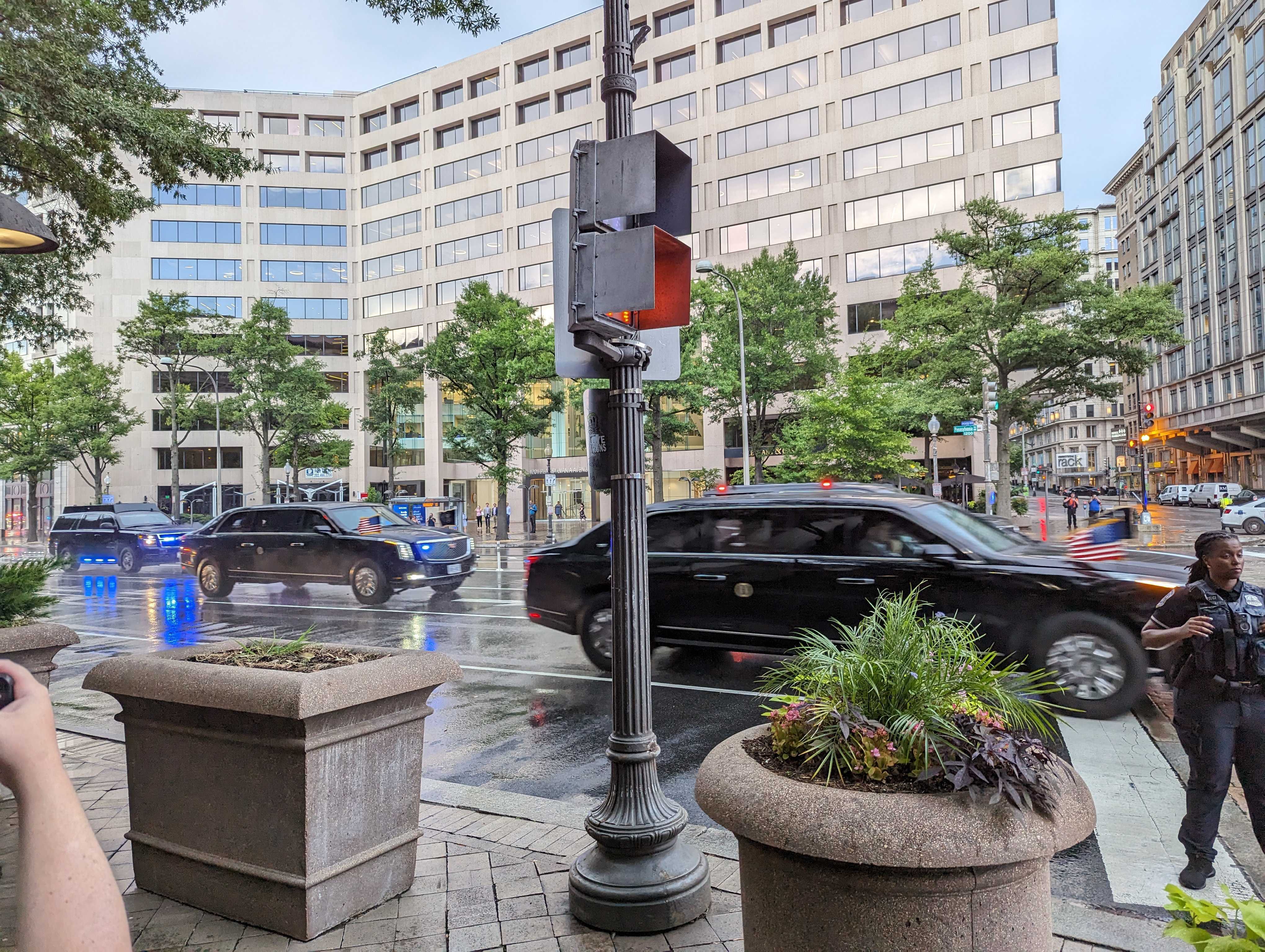 When we got off the DC Circulator at the bus stop closest to our parking garage, the rain immediately started to fall. Like Philly, the rain in DC was out to get us. Luckily, we were like 6 blocks away, so by the time we would make it to the parking garage, we were all thoroughly soaked. Once again, "C" was living her best life in the rain, enjoying every second of it. And honestly, I think we all were, after being so hot all day - it felt quite nice. We got to the corner of 12th and Pennsylvania, across from the parking garage we used, and the police had the road blocked off, preventing anyone from crossing the street. We asked what policewoman stationed at the crosswalk was happening but she said "all they tell us is that someone important is moving". We didn't have to wait long before a large contingent of police and secret service came driving down the road, flanking the president's vehicle. We looked online a little later and saw he was on his way from the White House to the National Archives. Pretty awesome!