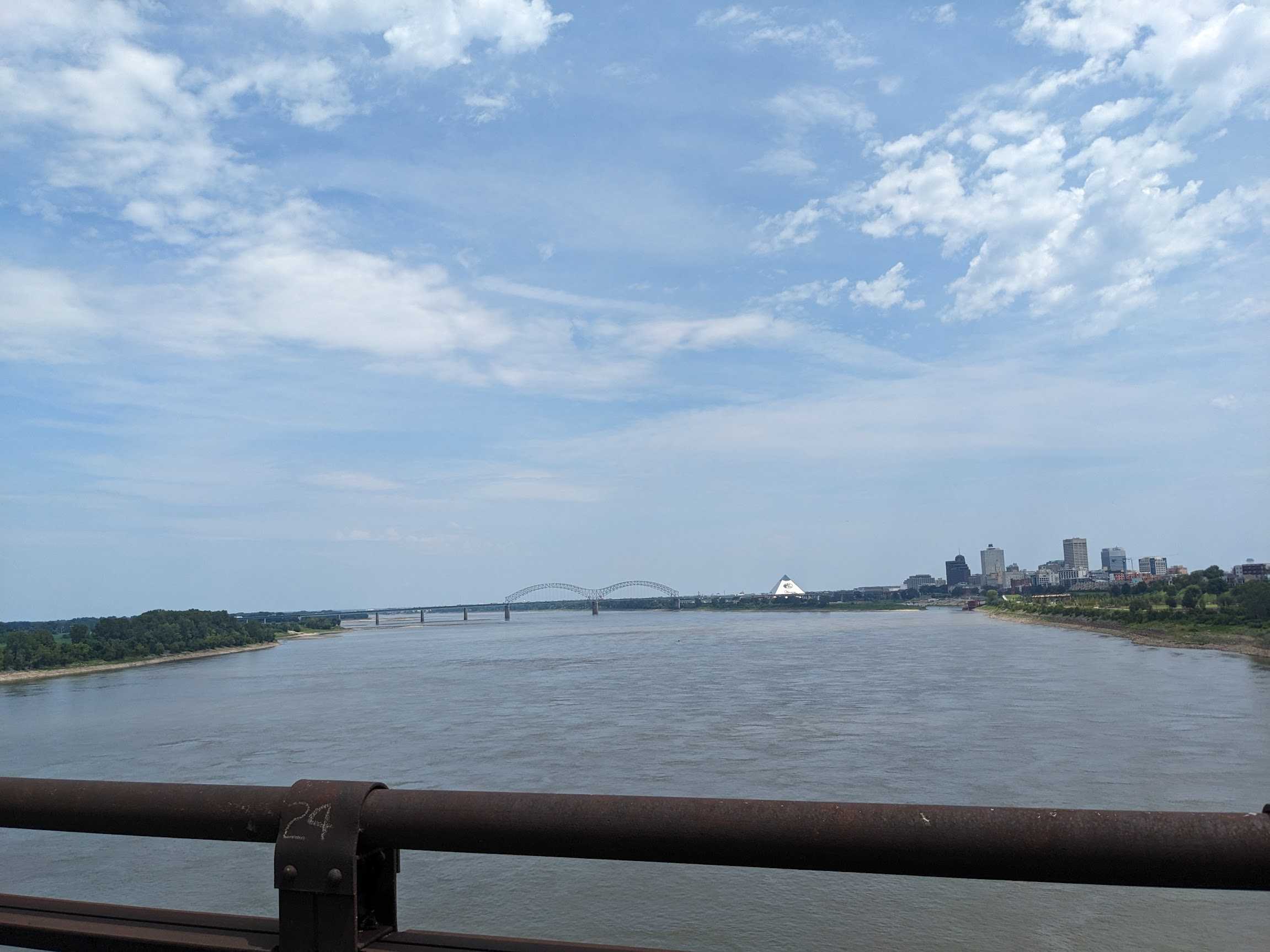 We drove the roughly 2 hours to Memphis in the morning, arriving a little before noon. Our first destination was Big River Crossing, which is "the longest pedestrian/bicycle across the Mississippi River". It was warm, but the bridge and clouds provided some nice cover. There was also a breeze running along the river that was unfortunately blocked by the train parked directly next to the pedestrian crossing. Still, it made for some pretty views of Ol' Miss and the city of Memphis. We walked all the way across and touched the Arkansas side before walking back.